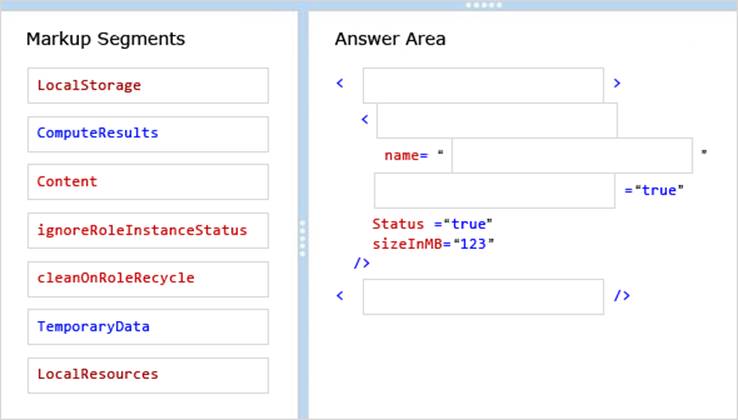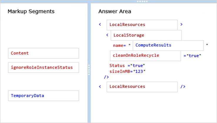 What should you do? To answer, drag the appropriate XML segments to the correct locations. Each XML segment may be used once, more than once, or not at all. You may need to drag the split bar between panes or scroll to view content.