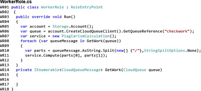 The plagiarism detection service runs on an Azure worker role. The computation uses a random number generator. Certain values can result in an infinite loop, so if a particular work item takes longer than one hour to process, other instances of the service must be able to process the work item. The Azure worker role must fully utilize all available CPU cores. Computation results are cached in local storage resources to reduce computation time.