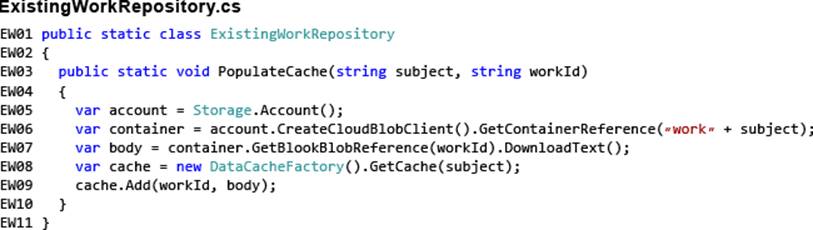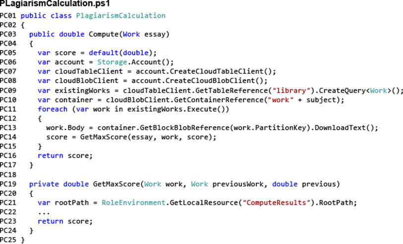 The plagiarism detection service works by comparing student submissions against a repository of existing works by using a custom matching algorithm. The master copies of the works are stored in Azure blob storage. A daily process synchronizes files between blob storage and a file share on a virtual machine (VM). As part of this synchronization, the ExistingWorkRepository object adds the files to Azure Cache to improve the display performance of the website. If a student's submission is overdue, the Late property is set to the number of days that the work is overdue. Work files can be downloaded by using the Work action of the TeacherController object